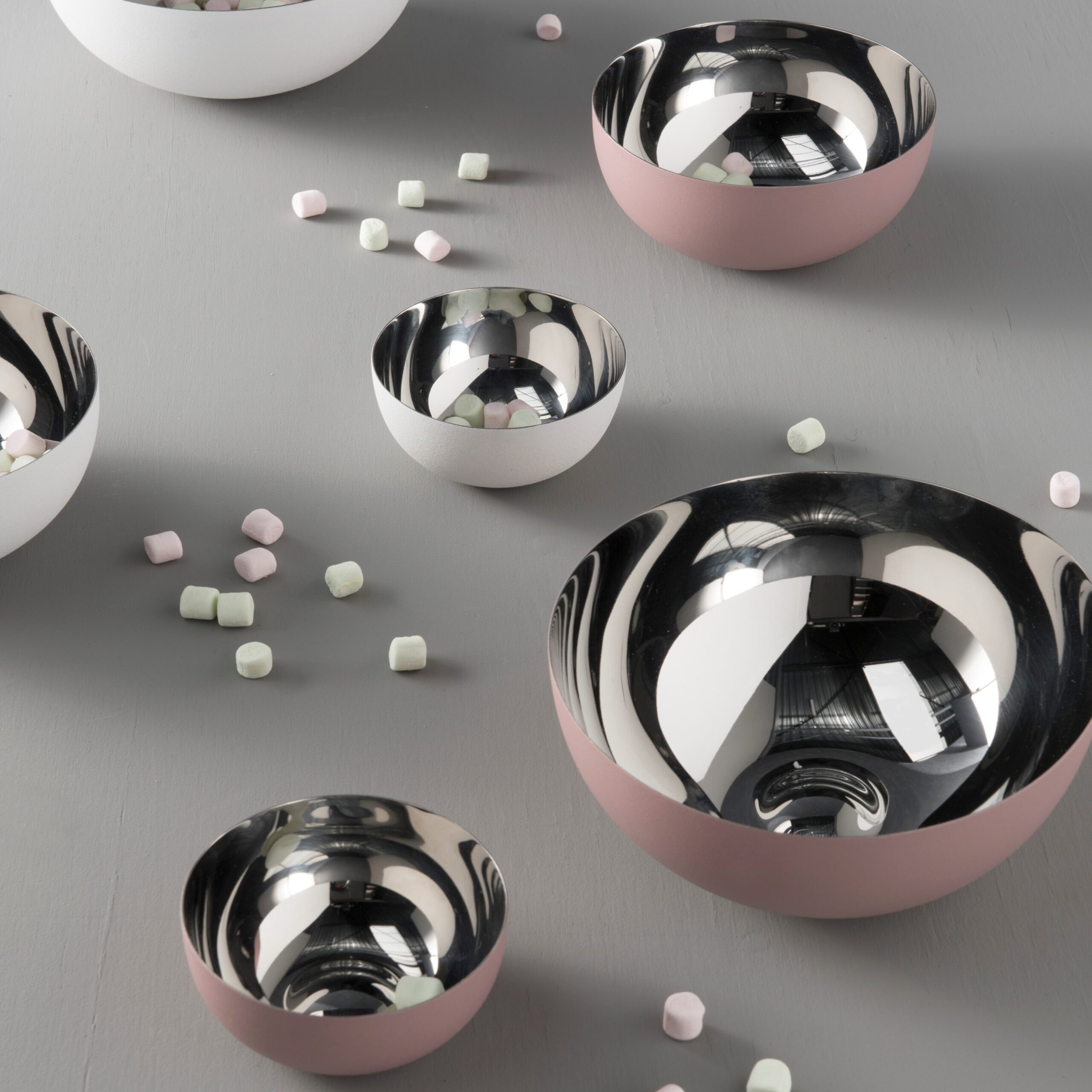 Moderný set troch misiek z nehrdzavejúcej ocele holandskej značky PresentTime. Priemer: 10 cm, 15 cm a 19,5 cm